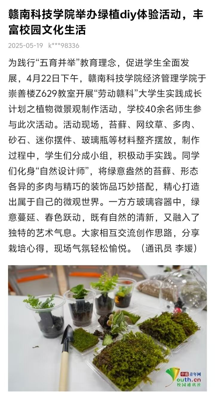 为践行“五育并举”教育理念,促进员工全面发展,4月22日下午,威廉希尔足球官方网站于崇善楼Z629教室开展“劳动赣科”老员工实践成长计划之植物微景观制作活动,学校40余名师生参与此次活动。活动现场,苔藓、网纹草、多肉、砂石、迷你摆件、玻璃瓶等材料整齐摆放,制作过程中,员工们分成小组,积极动手实践。同学们化身“自然设计师”,将绿意盎然的苔藓、形态各异的多肉与精巧的装饰品巧妙搭配,精心打造出属于自己的微观世界。一方方玻璃容器中,绿意蔓延、春色跃动,既有自然的清新,又融入了独特的艺术气息。大家相互交流创作思路,分享栽培心得,现场气氛轻松愉悦。(通讯员 李媛)